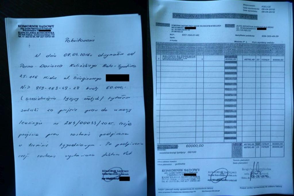 - Komornik twierdzi teraz, że wziął zaledwie 60 tysięcy i posługuje się odręcznie napisanym oświadczeniem. Dołączył do tego fakturę VAT. Oba dokumenty są fałszywe i podpieczętowane stęplem kancelarii komorniczej jako instytucji zaufania publicznego - tłumaczył wczoraj dziennikarzom Jakub Jastrzębski jeden z pełnomocników pokrzywdzonego, prezentując omawiane dokumenty.